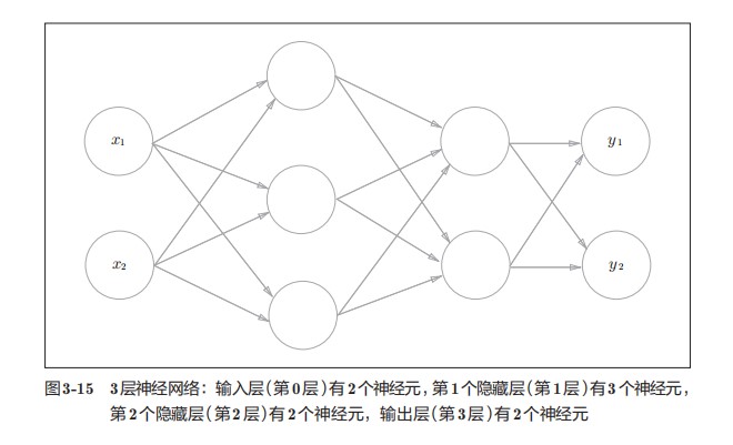 用图来表示神经网络的话,如图3-1所示。我们把最左边的一列称为输入层,最右边的一列称为输出层,中间的一列称为中间层。中间层有时也称为隐藏层。“隐藏”一词的意思是,隐藏层的神经元(和输入层、输出层不同)肉眼看不见。另外,把输入层到输出层依次称为第0层、第1层、第2层(层号之所以从0开始,是为了方便后面基于Python进行实现)。图3-1中,第0层对应输入层,第1层对应中间层,第2层对应输出层。