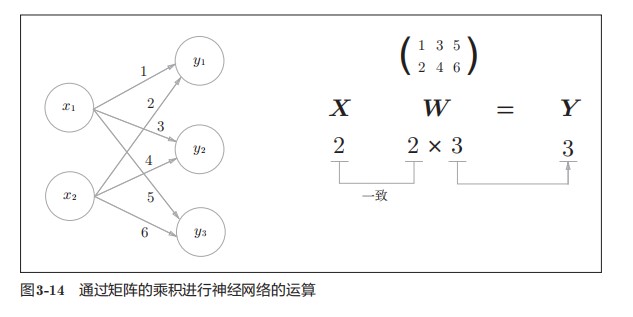 使用np.dot(多维数组的点积),可以一次性计算出Y 的结果。这意味着,即便Y 的元素个数为100或1000,也可以通过一次运算就计算出结果!如果不使用np.dot,就必须单独计算Y 的每一个元素(或者说必须使用for语句),非常麻烦。因此,通过矩阵的乘积一次性完成计算的技巧,在实现的层面上可以说是非常重要的。