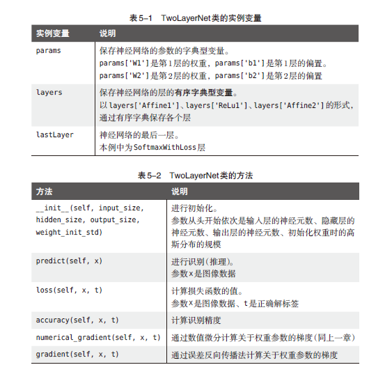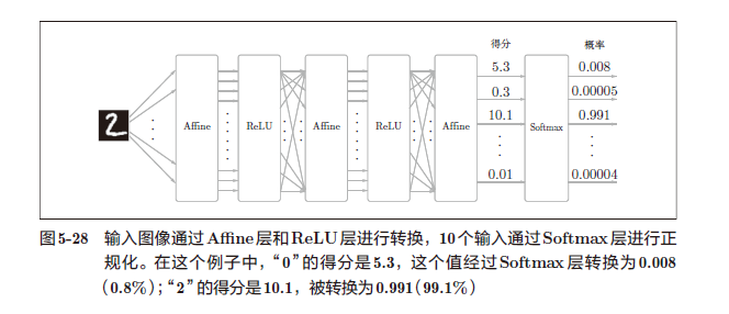 神经网络中进行的处理有推理(inference)和学习两个阶段。神经网络的推理通常不使用Softmax 层。比如,用图5-28 的网络进行推理时,会将最后一个Affine 层的输出作为识别结果。神经网络中未被正规化的输出结果(图5-28 中Softmax 层前面的Affine 层的输出)有时被称为“得分”。也就是说,当神经网络的推理只需要给出一个答案的情况下,因为此时只对得分最大值感兴趣,所以不需要Softmax 层。不过,神经网络的学习阶段则需要Softmax层。