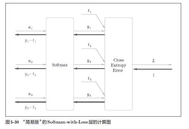 使用交叉熵误差作为softmax 函数的损失函数后,反向传播得到(y1 − t1, y2 − t2, y3 − t3)这样“ 漂亮”的结果。实际上,这样“漂亮”的结果并不是偶然的,而是为了得到这样的结果,特意设计了交叉熵误差函数。回归问题中输出层使用“恒等函数”,损失函数使用“平方和误差”,也是出于同样的理由(3.5 节)。也就是说,使用“平方和误差”作为“恒等函数”的损失函数,反向传播才能得到(y1 −t1, y2 − t2, y3 − t3)这样“漂亮”的结果。