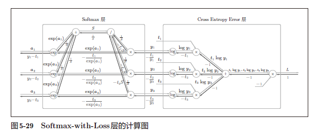 这里考虑一个具体的例子,比如思考教师标签是(0, 1, 0),Softmax 层的输出是(0.3, 0.2, 0.5) 的情形。因为正确解标签处的概率是0.2(20%),这个时候的神经网络未能进行正确的识别。此时,Softmax 层的反向传播传递的是(0.3, −0.8, 0.5) 这样一个大的误差。因为这个大的误差会向前面的层传播,所以Softmax层前面的层会从这个大的误差中学习到“大”的内容。