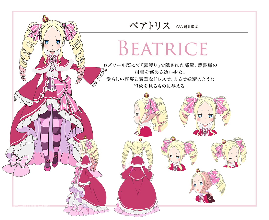 | 碧翠丝(ベアトリス,[Beatrice]),又译贝亚托莉丝,被昴昵称碧翠子/贝亚子 大精灵,外表是十一二岁的可爱萝莉,金色的长螺旋状卷发,穿着华丽的礼服。 罗兹瓦尔宅邸禁书库的图书管理员,自称贝蒂。很粘帕克,称帕克为哥哥。 虽然很不直率而且毒舌,但本性善良。曾为了帮助昴而与他缔结契约。 |