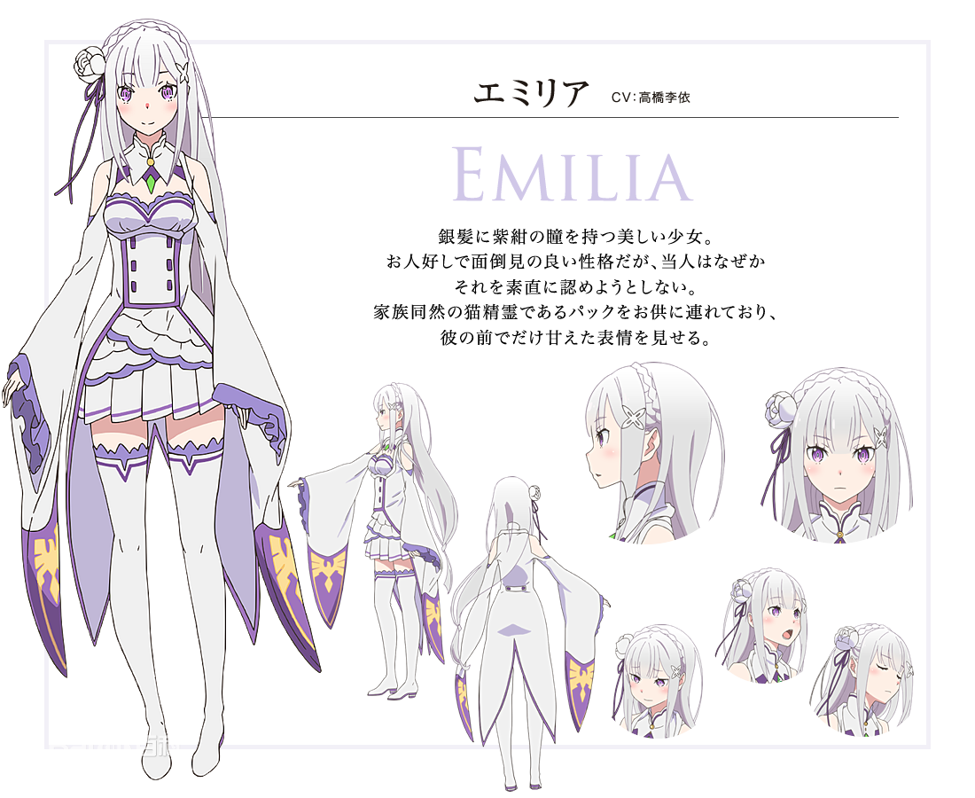 | 爱蜜莉娅(エミリア,[Emilia]) 女主角,也译作艾米莉娅。 梦幻的银发,如雪的肌肤,魅惑的蓝紫色瞳孔,以及如精灵的尖耳。 半妖精的美少女,也是精灵术士,因为外貌与传说中的嫉妒魔女・莎缇拉相像而常被人忌讳。 曾被称为活在结冻之森的“冰结魔女”,初登场年龄114岁,心理年龄只有14岁。 (7岁冰冻,沉睡100年后被帕克救出,生活7年后遇到昴。) 老好人的善良性格,但本人坚决否认。因为很少与人打交道,所以只会在猫精灵帕克面前露出撒娇般的表情。 露格尼卡王国的5位王位继承者候选人之一,常被菜月昴爱称为EMT。 |