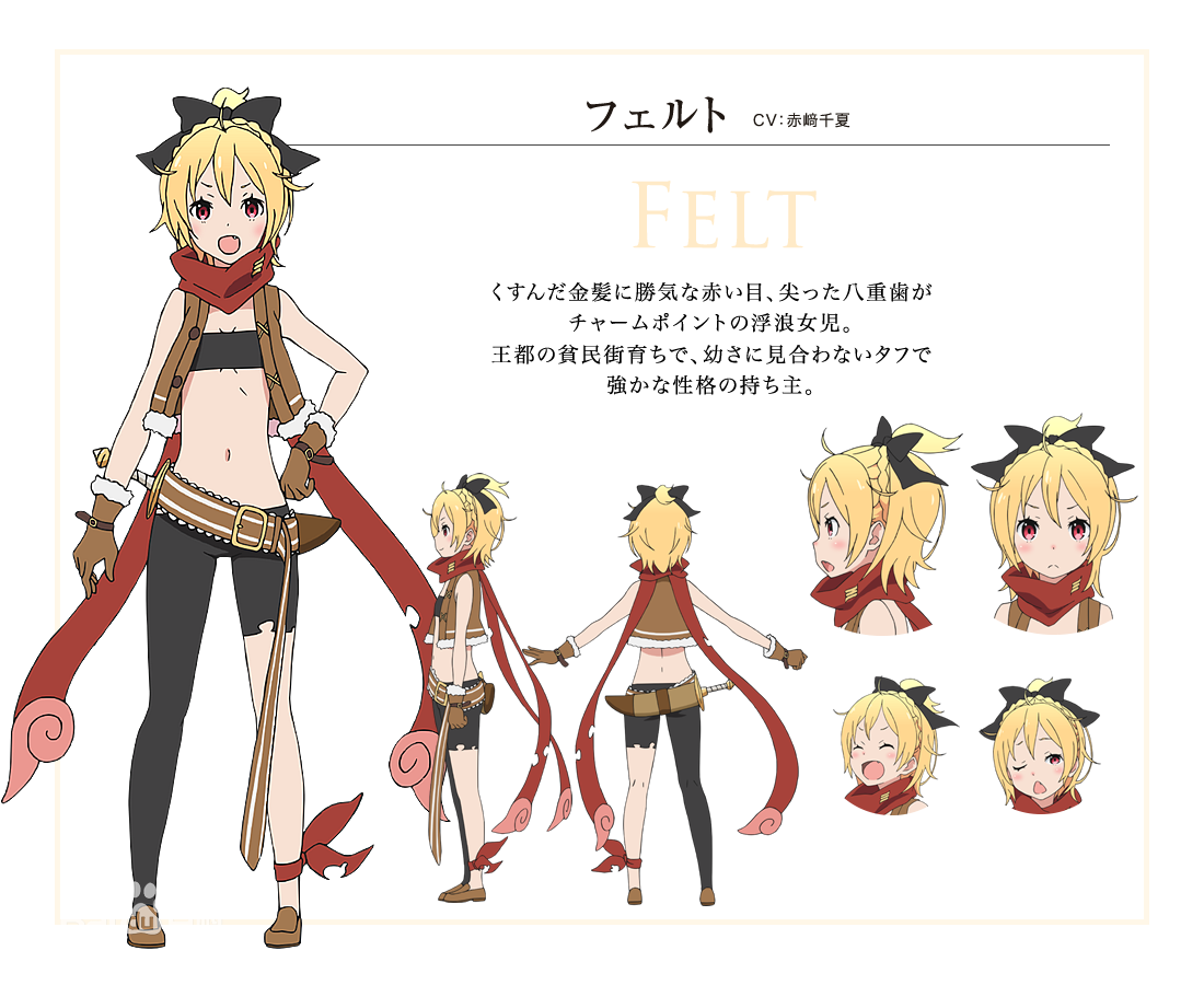 | 菲鲁特(フェルト,[Felt]) 15岁的流浪少女,有着枯黄的金发与好胜的红眸。 自小在贫民窟长大,被世界眷顾而得到的风之加护,拥有超常的敏捷速度,为了自己的理想才逼不得已当上盗贼。 真实身份为过去被掳走的先王的王弟——佛鲁德大人的千金,在莱因哈鲁特的拥护下成为了第5位国王候补人。 |