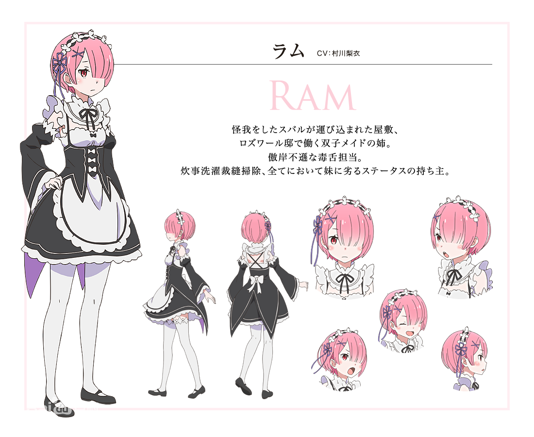 | 拉姆(ラム,[Ram]) 鬼族,罗兹瓦尔宅邸工作的双胞胎女仆的姐姐,特征是红发与左刘海。 不擅长料理,对罗兹瓦尔绝对忠诚与爱慕,拥有操纵风的能力。 曾是鬼族中最强大的存在,号称“无角的鬼神”。 在魔女教袭击村落时,被砍掉了力量的源泉“角”后弱化,依靠罗兹瓦尔的魔力补给。 桀骜不驯的毒舌担当,眼神、言行都很紧,负责教育作为男仆的昴,并故意称呼他为巴鲁斯(卯日)。 |
