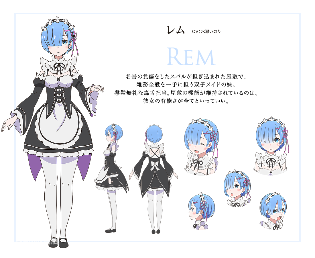 | 雷姆(レム,[Rem]) 鬼族,罗兹瓦尔宅邸工作的双胞胎女仆的妹妹,特征是蓝发与右刘海。 虽然外貌与姐姐几乎一样,但是家务万能,胸部也比较大。假献殷勤的毒舌担当,眼神温柔稳重, 虽然一开始对昴抱有极强的敌意甚至下了杀手,但是最终爱上了昴。 |