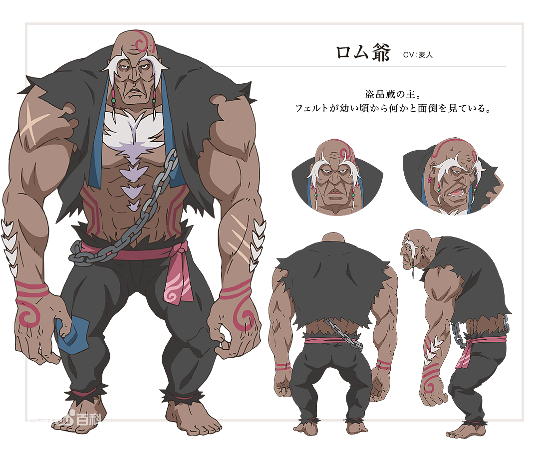 | 克罗姆威尔(クロムウェル,[Cromwell]) 简称罗姆爷,肌肉发达、身高超过2米的巨人族老人。 居住在王都的贫民街,管理盗贼们藏匿及销售赃物的地方。 与可憎的外表相反,意外地是个好心人,并将菲鲁特视为自己的家人一般照顾着她。 |