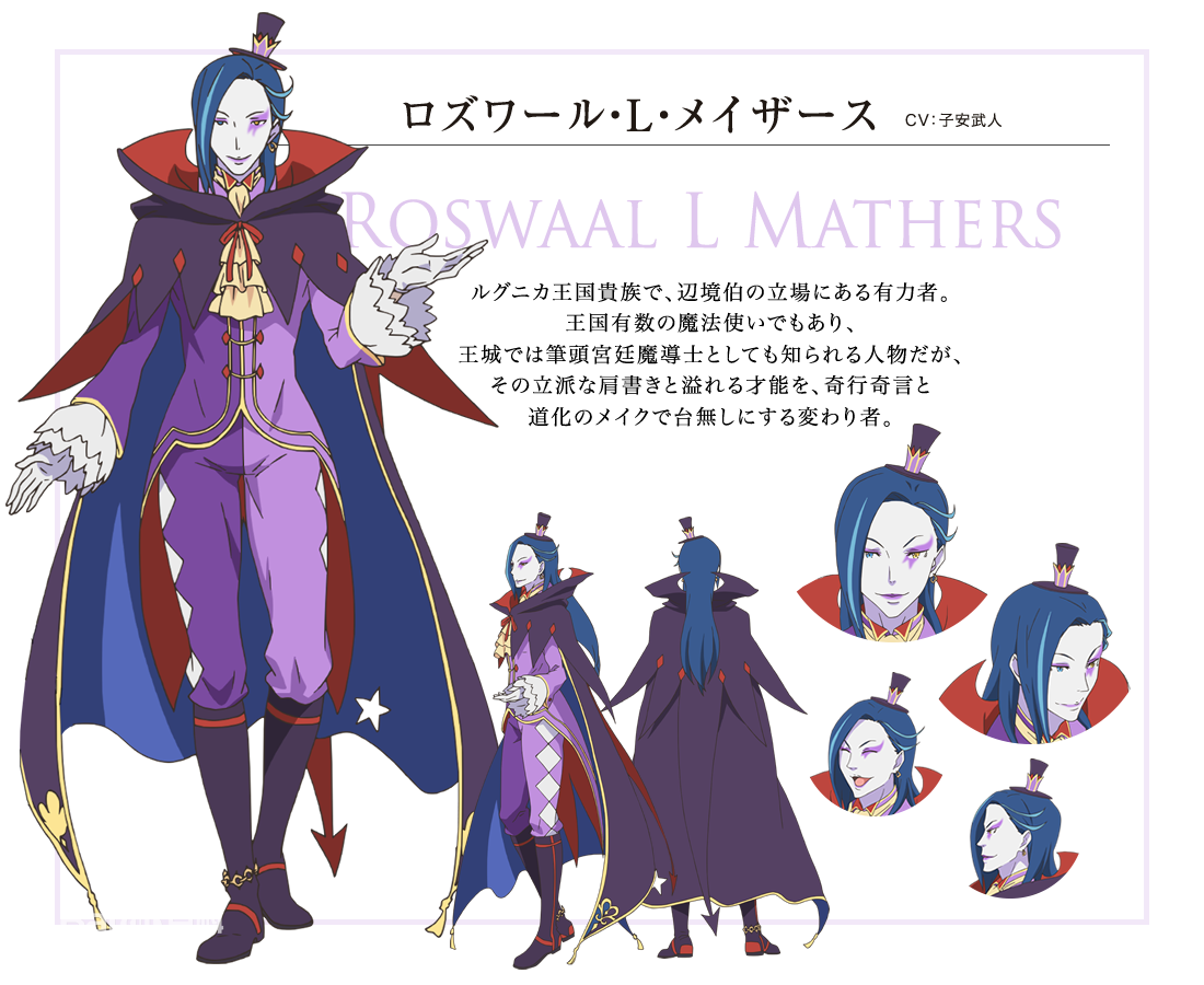 | 罗兹瓦尔・L・梅札斯(ロズワール・L・メイザース,[Roswaal L Mathers]) 左黄右蓝的不同瞳色,深蓝色的披肩长发,惨白的肤色与纤细的身形,画着小丑般的脸妆以及配色奇特的服饰。 宅邸的主人,爱蜜莉雅候补人的后援支持者。卢克尼卡王国的边境伯爵,也绰号“宫廷魔法师”, 是王国最厉害的魔法师,收留拉姆姐妹,并让她们在宅邸工作。 愿望是弑龙,为此聚集可利用的棋子。 |